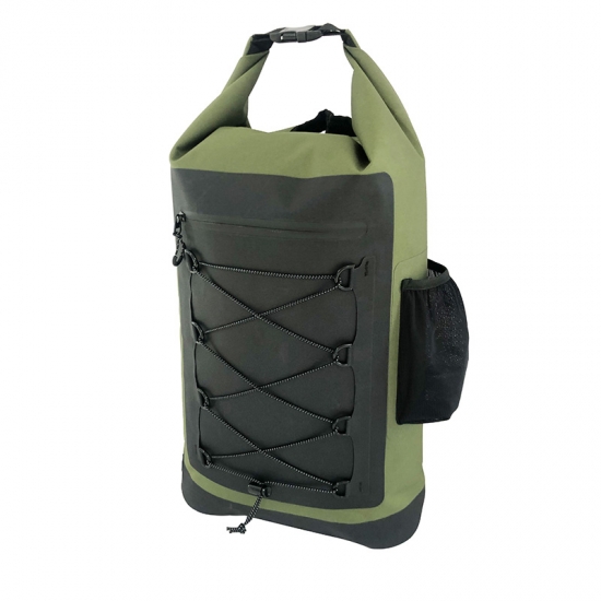 The green rooltop dry backpack is made of wear resistant waterproof 600D TPU fabrics andwelded seams.It's constructed of a super capacity main compartment,a side mesh pocket and a front patch pocket.Suspension system is designed to lighten the burden of gear-hauling when canoeing, canyoneering and travelling.Dryseal roll-top closure offers intuitive sealing, waterproof protection and side compression straps.Shoulder straps provide comfortable padding taking the edge off loads.